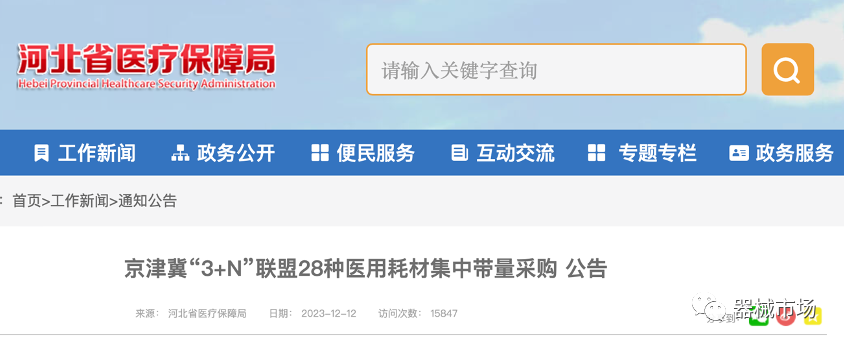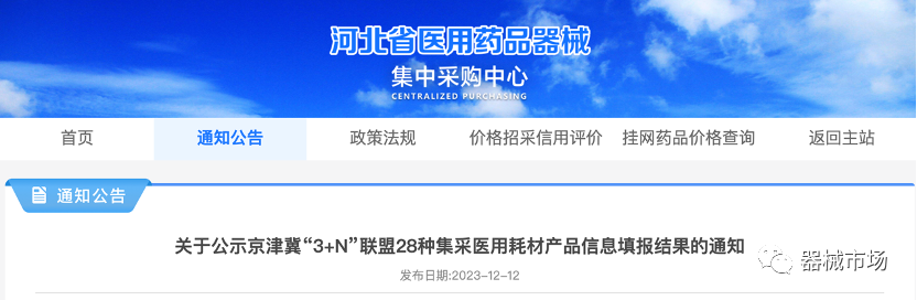 2023年12月12日,《京津冀“3+N”联盟28种医用耗材集中带量采购公告》发布,并公示了参与省份名单。同日,河北省医用药品器械发布《关于公示京津冀“3+N”联盟28种集采医用耗材产品信息填报结果的通知》。